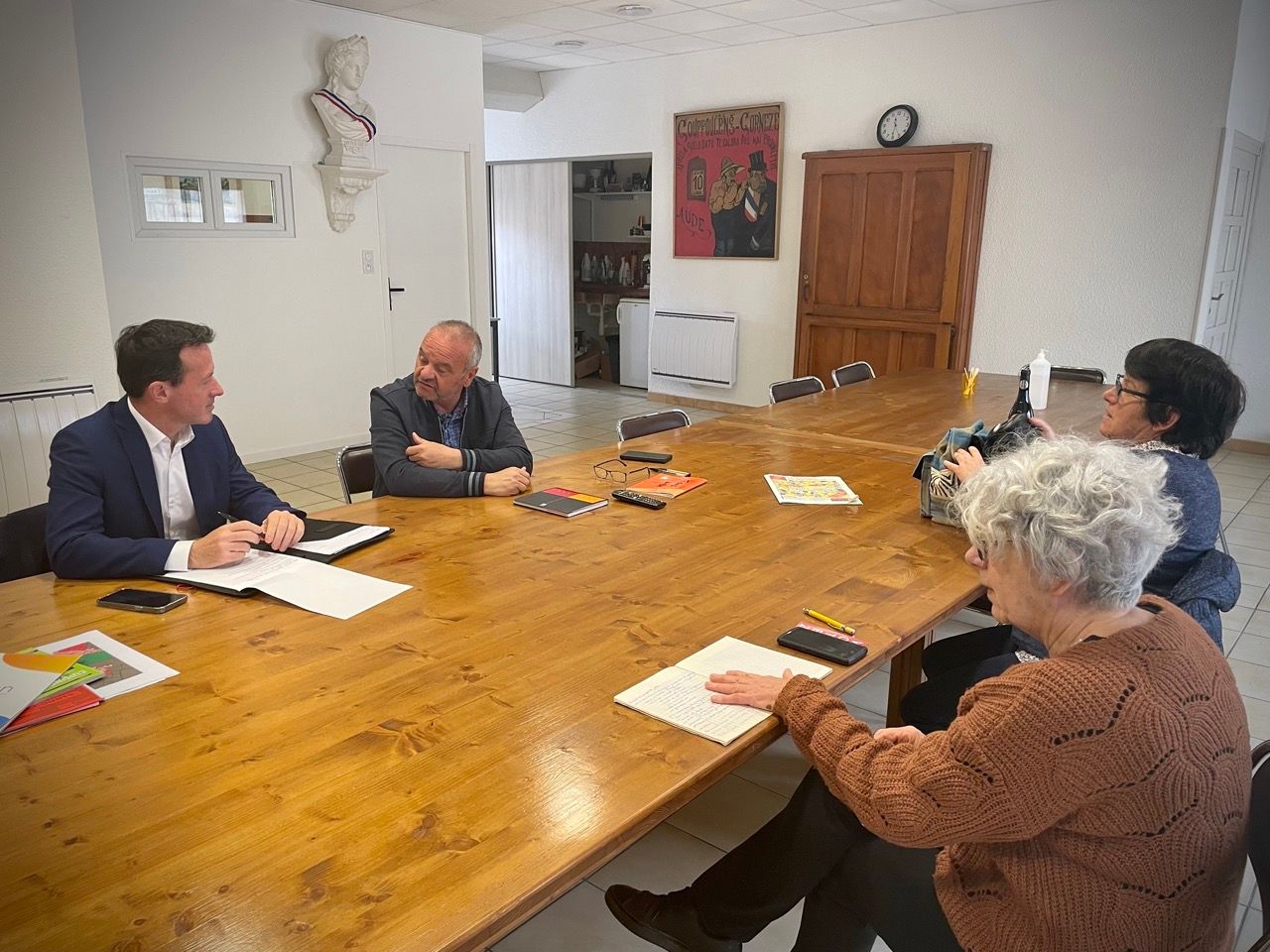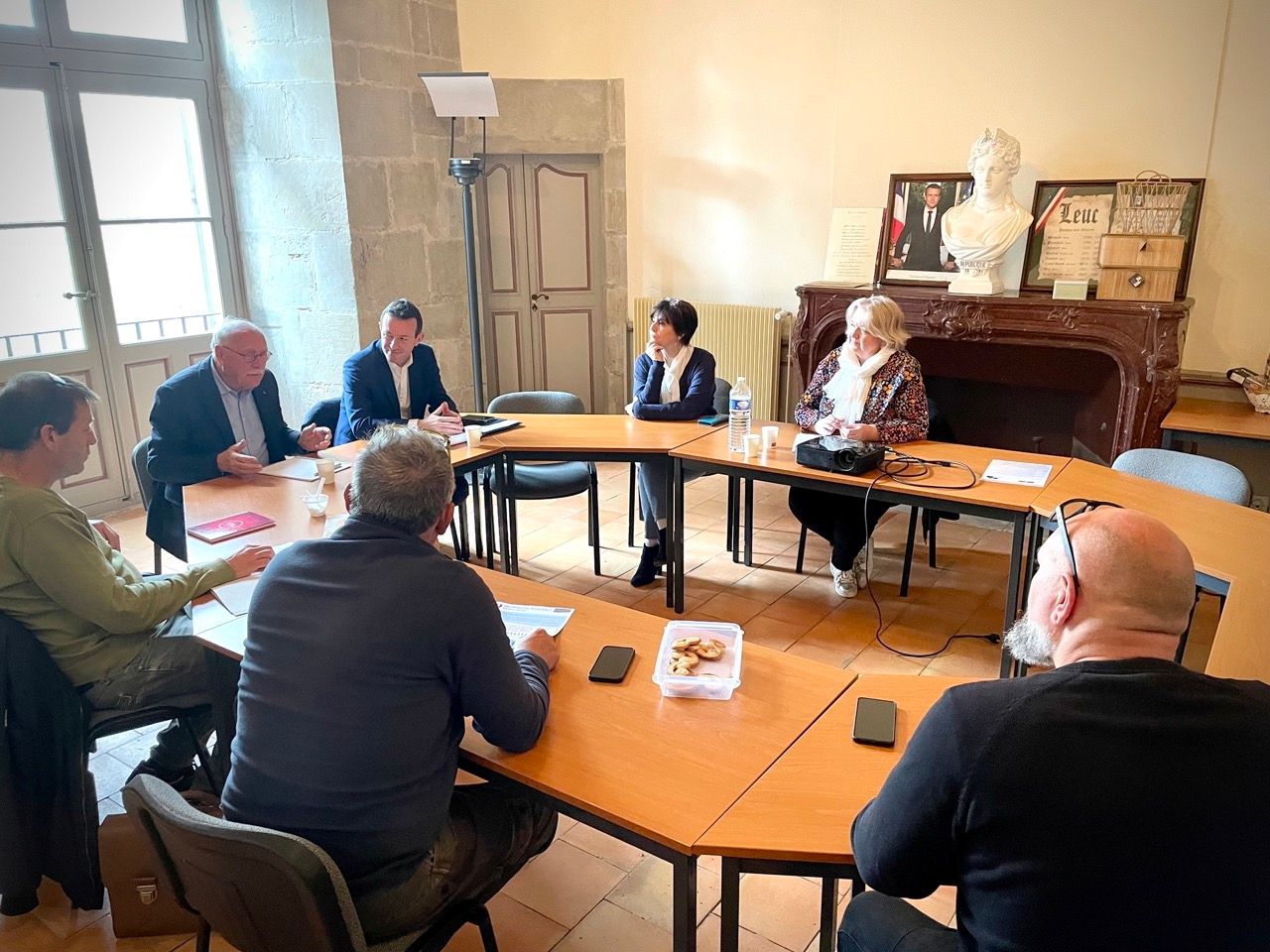 Ce matin, à Leuc, une commune du sud de Carcassonne de 850 habitants, j’ai retrouvé le Maire Jean-Marie Jordy et son équipe au sein de la magnifique Mairie implantée dans l’ancien château qui surplombe le village. Nous avons évoqué les projets réalisés et à venir de la commune (traversée de village, foyer…), mais aussi le manque de marge de manœuvre financière propre à beaucoup de communes, qui de plus en plus perdent de l’autonomie financière, voyant les recettes diminuer tandis que l’inflation fait exploser tant les charges courantes que les coûts des travaux… Les transports étaient aussi l’objet de discussions, avec l’avenir de la ligne de chemin de fer qui dessert le territoire.